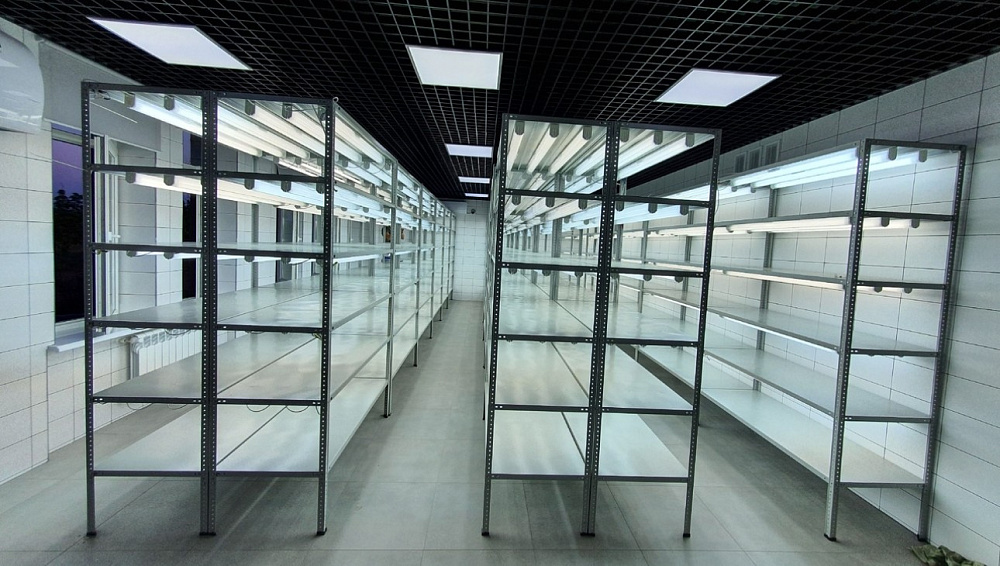 Оборудование стеллажей люминесцентными лампами (3шт под каждой полкой) и кнопкой-выключателем на каждой полке для выращивания растений.